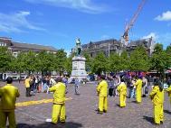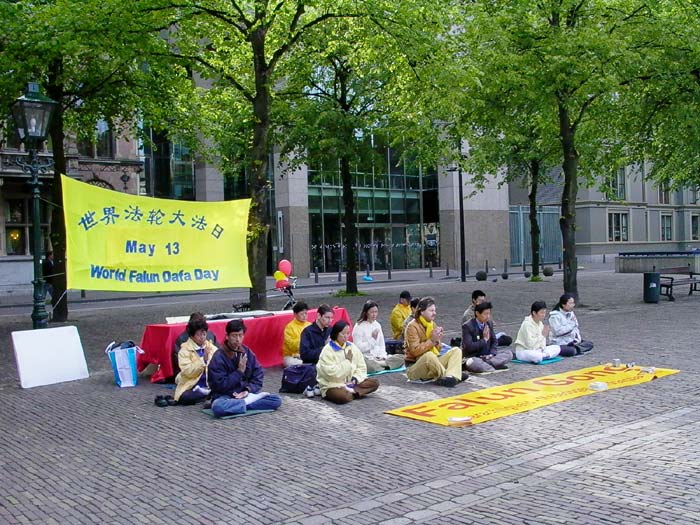 海牙是荷兰的政治中心,是著名的国际法庭所在地;国家的议会大楼就位于广场的旁边。今天议员们正在议会里讨论;但是突然发生的火警信号使所有的议员及大楼的工作人员离开大楼来到广场,有幸观看了我们的大法日活动。