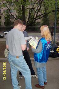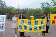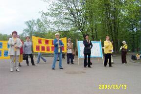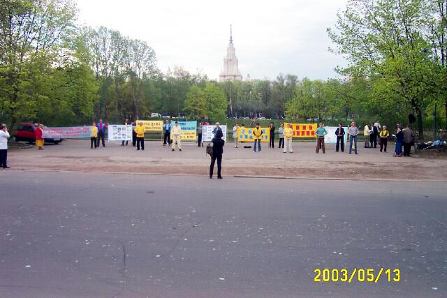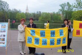 【明慧网2003年5月15日】5月13日世界法轮大法日,莫斯科和彼得堡大法学员再次来到在莫斯科中使馆前和平请愿,强烈要求中国政府停止镇压法轮功和法轮功学员,同时向路人讲清真象。学员们以此特殊的方式庆祝世界法轮大法日。学员们举着中、俄文标语:“停止