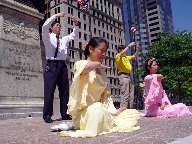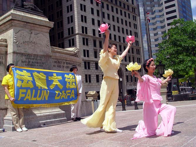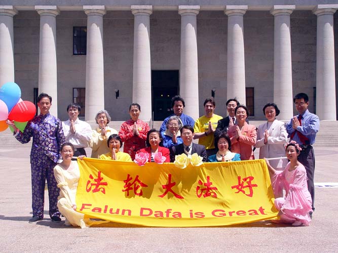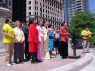 学员们别开生面的文艺演出和布置在周围的正法之路图片展吸引了许多政府官员和路人驻足观看。在演示了法轮功的五套功法之后,学员们表演了笛子和箫独奏、莲花舞、独唱、诗朗诵等精心准备的节目。中西学员合唱的“为你而来”打动了在场许多人的心。全体中西学员一起登台合唱的“法轮大法好”将庆祝活动推向了高潮。最后,全体学员在州政府大楼前向师尊合十、祝愿。