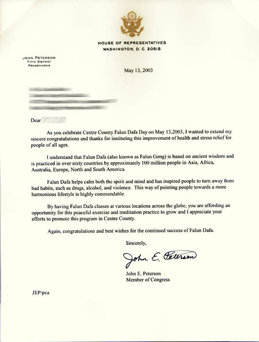 正当你们庆祝2003年5月13日中心县法轮大法日之际,我希望表达我诚挚的祝贺,并感谢你们致力于促进各年龄人们的健康和缓解压力。