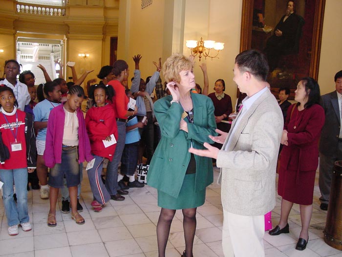 5月13日是伟大的师尊五十二华诞,也是世界法轮大法日。中午从12点到1点,学员们在州政府南大厅进行了隆重的庆祝活动。会上,先由乔治亚州州长的代表宣读了州长办公室的褒奖状,然后又分别宣读了来自亚特兰大市长弗兰克林女士,乔州众议员约翰·路易斯,众议员大卫·斯考特的贺信。市长和议员们都在信中高度赞扬了法轮大法的真、善、忍,并祝贺庆祝活动和图片展圆满成功。接着,学员们向与会者表演了祥和、优美的五套功法,获得阵阵掌声。随后,前乔州众议员鲍勃·巴尔和Georgia Southern University 的约翰·帕索尔教授也分别发表了演讲,赞扬大法的美好,谴责了在中国发生着的对法轮功学员的残酷人权迫害。最后,法轮功学员表演了自编自导的一些节目,展现了学员们多才多艺的一面,也让在场的美国朋友们领略了美妙的东方文化。