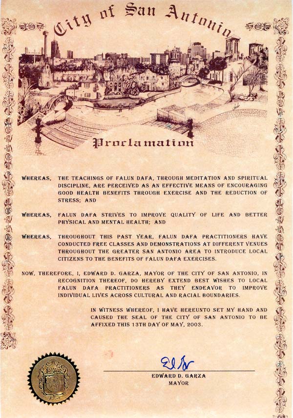 因此,现在,我,圣安东尼奥市市长爱德华.格尔扎,特此向本地法轮大法修炼者致以最美好的祝愿,并表彰他们超越文化和种族界限,致力于改善每个人的生活所付出的努力。