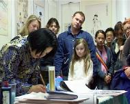 展销会的组织者说,「我很喜欢法轮功的五套功法,让人非常放松,我需要它。」她允许我们把法轮功的真相材料和请愿书留在展厅的一张桌子上。她说,「你们可以随时来这里向人们介绍法轮功。」