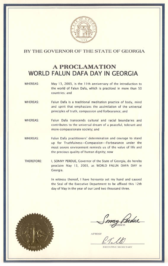 因此,我,乔治亚州州长桑尼-普杜,在此宣布2003年5月13日为乔州世界法轮大法日。