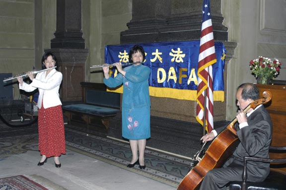 法轮功学员、著名音乐之家陈汝棠夫妇和女儿同台演奏乐曲“普度”、“庆祝”等。法轮功学员进行了功法表演。