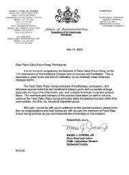 我很荣幸在法轮大法(法轮功)--一种中国传统的炼习和打坐--洪传11周年之际庆祝法轮大法(法轮功)修炼者。特别荣幸能在我们庆祝美籍亚裔文化月之时来庆祝。