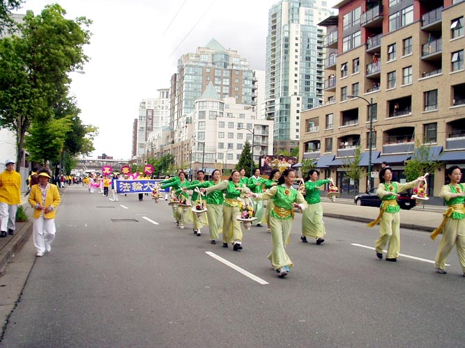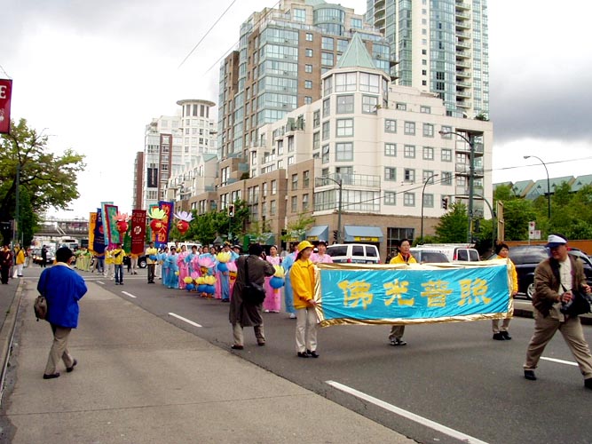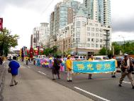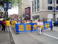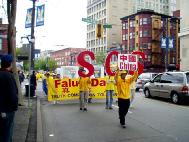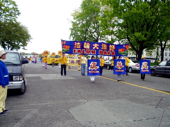 开幕仪式后,游行队伍在警察的领路下,从Thorton公园出发,沿着缅街、喜士定街,一路进发到市中心的美术馆。有一千多人参加了游行,分成十个方队。走在最前面的是中国传统舞蹈队、花车和功法展示,而后的方队主要是按洲划分,分别代表着来自亚洲、欧洲、南美洲、澳洲、非洲以及加拿大、美国和中国的法轮功学员,最后是小弟子方队。游行队伍中,随处可见大大小小的、以黄色、红色为主的横幅,充满着喜庆。在这个洋溢着节日气氛的队伍中,有一个方队却与众不同,就是“中国”方队。大约有十几个人,据了解其中包括从大陆营救出来的几名法轮功学员。他们穿着白色的服装、手持一束白花,表情庄重。他们举着“SOS”横幅,呼吁善良的人们继续帮助营救在中国大陆遭受迫害的法轮功学员。