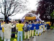 法轮功学员在中国城的Thorton公园集体炼功后,举行了简短的开幕式。满地宝(Portmoody)市市长以及全球和平民主联盟温哥华支盟理事郭家欣等佳宾分别发言,赞誉法轮功学员坚持真善忍,并谴责中国政府迫害法轮功修炼者。