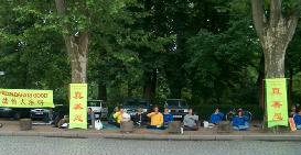 二零零三年五月十五日,大法弟子于早上十点抵达目的地后,便挂上德文及英文的横幅,展现法轮大法好和揭露大法弟子在中国所遭受的残酷迫害。大法弟子们有条不紊地炼功,发正念和向路人发传单讲真相。请愿活动直到下午六点才结束。现场气氛非常融洽祥和,两千多份资料被分发一空。