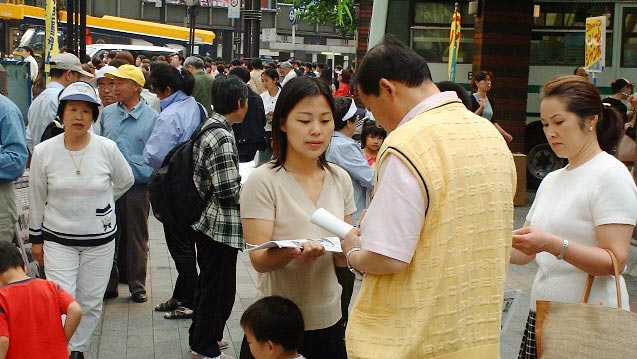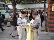 今年5月上旬开始,日本学员去国会向每一位议员送交最新的法轮功受迫害资料和金子容子的最新情况及呼吁救援信,巨幅的呼吁横幅醒目地挂在到国会议员会馆的必经之路上,学员们同时向来往行人分发真相资料。到会馆里送材料的学员常常会听到议员或议员办公室人员说:啊,你们就是天天在下面请愿的法轮功啊。而这些了解情况的人们对于救援活动就有比较积极的态度。