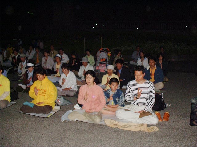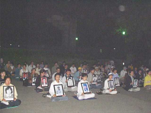 在位于日本政治经济文化中心的日比谷公园,5月24日晚日本大法学员们为在中国大陆被迫害致死的700多位同修举行烛光守夜。学员们手捧死难同修的遗照、萤光棒,庄严肃穆端坐在露天剧场前,在最前面摆放着死难同修的遗照和“停止虐杀”4个大字。