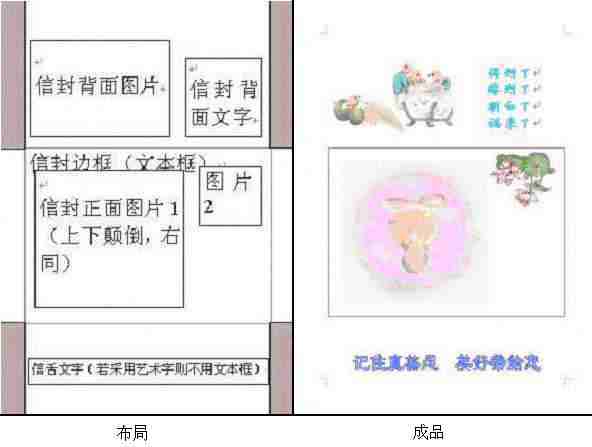 以后再插入的文本框都改选为无线条色。在此大文本框里面再插入两个小文本框,文本框大小视个人喜好定,在文本框中插入图片,在菜单栏选插入(I)→图片→来自文件,选择自己喜欢的文件,按确定,然后根据需要调整图片及文本框的大小和文本框的位置即可。在另外一个小文本框中也插入图片,注意此两个文本框中的图片需倒过来放,倒置的方法在下一段介绍。这个大文本框就是信封的正面,而上下的两部分将折成信封的背面,在较窄的那部分插入文本框中放一句话,(也可插入艺术字,则不用文本框)作为信舌,在信封背面的另外一部分插入文本框后,在文本框中再插入图片,其高度最好别超过5cm,否则可能被折过来的信舌盖住(也可根据需要把信舌裁窄)。