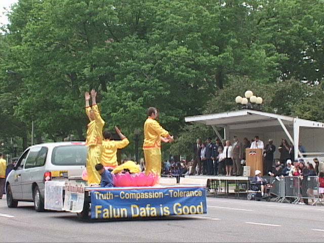 【明慧网2003年5月29日】五月二十四日,美国科罗拉多州大法弟子参加“国殇日”大游行。在游行中,法轮大法的花车格外引人注目。在花车上,中西族裔大法弟子表演了功法,并有大法弟子随行向观众发放了大法真相传单。
