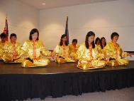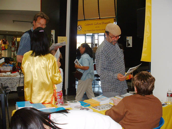 学员应文化节的邀请表演了五套功法,学员在台上表演时,台下的观众全神贯注,有的观众在观众席上跟着台上的学员炼功。表演结束后不少观众到我们的摊位咨询、索取资料;一位西装革履的男士在我们将要离开的最后一分钟赶到我们的摊位,当他找到我们时,他深深地松了口气说:“终于找到你们了!”