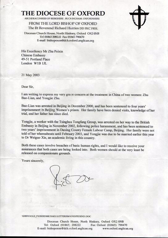 我写信是想告诉您我对朱宝莲和朱永洁两位妇女在中国所受的遭遇表示严重关注。