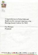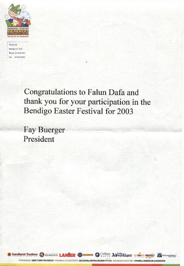 【明慧网2003年5月6日】墨尔本法轮功学员在今年墨尔本北部著名淘金城及旅游城班迪沟(Bendigo)的复活节“黄金的过去,金色的未来”(Golden Past, Golden Future)庆典中以出色的表现分别获得“最佳社团奖(Best Community)”及“最佳主题表现奖(Best Depiction of the Theme)”。庆典组委会向法轮功学员致信感谢,并将学员游行的录像资料珍重地收入班迪沟市的文档资料之中,作为对外推介班的资料之一。
