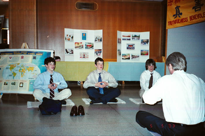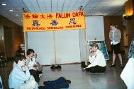 大纪元报导,进入加拿大卡尔顿大学学生活动中心的地下通道,映入眼帘的就是一幅色彩恬淡、令人赏心悦目的壁画:一个年轻、纤细的女孩坐在一个象征世界的球状体上打坐。许多学生和教授经过时,都放慢了匆匆的脚步,注目观看吉奈特现场作画。一位工程系的教授非常喜欢这幅壁画,他表示,希望中国(当权者)迫害法轮功的状况会尽快改变。