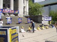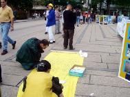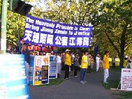 6月15日上午10点到下午4点在市中心艺术馆前摆展板、举大型横幅、炼功、征签、发传单。除“法轮大法好”、“真、善、忍”的中英文横幅外,还有“天理昭昭 公审江泽民”“法网恢恢 清算江泽民”两条大横幅。为了赶制横幅和展板,好些学员熬了好几个夜,第二天又照样参加活动。