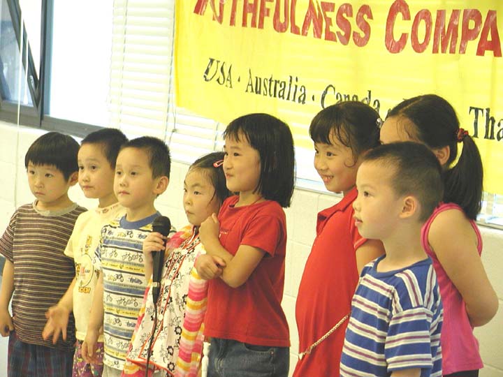 多位小同修上台讲述了他们学法炼功,讲真相的故事,很多都是用中文讲述的,没有稿件,但他们却都是在国外长大的孩子。大法为他们开启了智慧。一位刚刚4岁的小同修已经连续阅读《转法轮》四遍了,并且现在已经可以和大同修们坐在一起,流利地读《转法轮》了。明慧学校中已经有两位小同修在背《转法轮》,其中一位十岁的小弟子已经在背第二遍,他背到了第九讲。