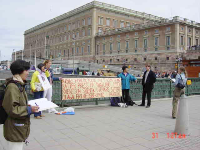 【明慧网2003年6月2日】为呼吁全社会关注仍在泰国被无理关押的法轮功学员普瑞佑·斯文森女士,瑞典斯德哥尔摩大法弟子连续开展征签活动。并以此活动揭露江氏集团迫害法轮功的罪行,支持对江的正义审判。