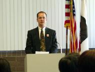 加州艾尔克航市庆祝首届“东圣地亚哥县法轮大法周”法轮功学员代表致开幕词马克.刘易斯市长为庆祝活动做主旨发言