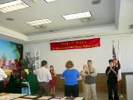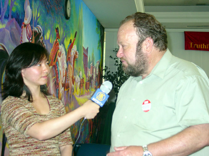 然后,全体与会者一同共同观看了介绍法轮大法的录像片。刘易斯市长接受了新唐人电视台的专门采访,并和法轮功学员合影留念。参加庆祝仪式的当地市民学习了法轮功功法。