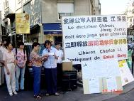 学员心里笑了:一定是这个标语牌打到了邪恶的神经要害;怎么使馆的人不敢要求拿掉那些有关法轮大法洪传世界、法轮功学员在中国大陆遭虐杀、酷刑的图板呢?是不是意味着他们承认这一切呢?