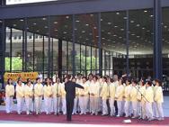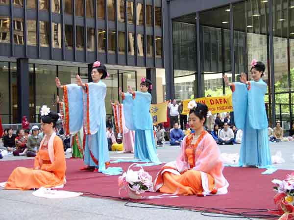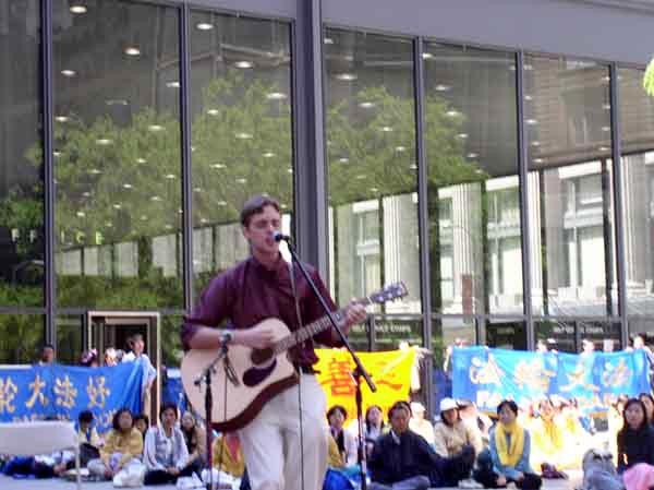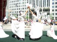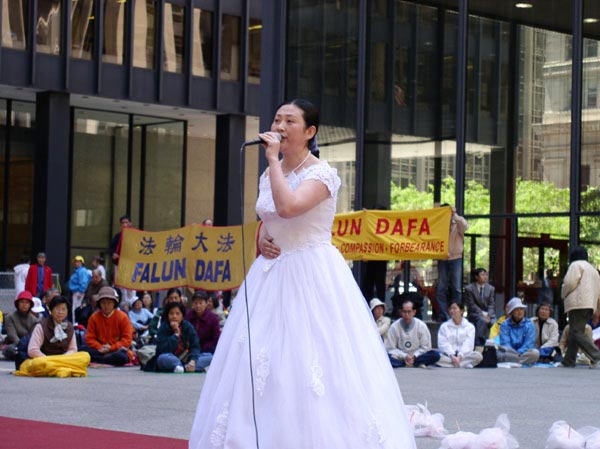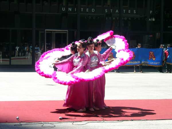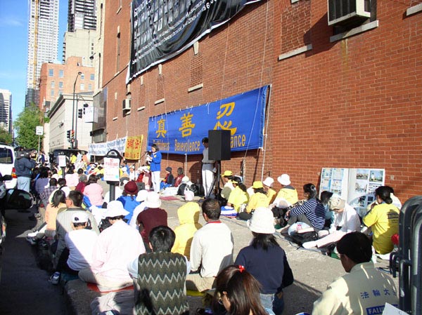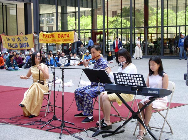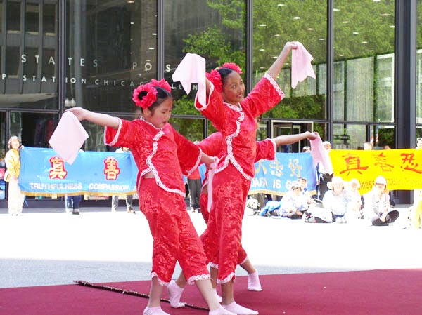【明慧网2003年6月23日】6月19日星期五,来自亚洲、欧洲、澳洲、及北美等30多个国家的大法弟子近2千人云集芝加哥,在中领馆前集体炼功发正念,并在联邦广场及汤普森中心(Thompson Center)举办两台大型文艺演出,从另一个角度向世人展示大法的美好祥和。