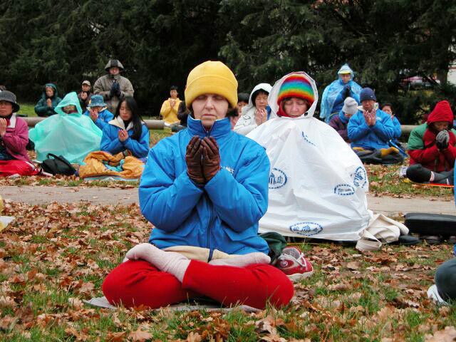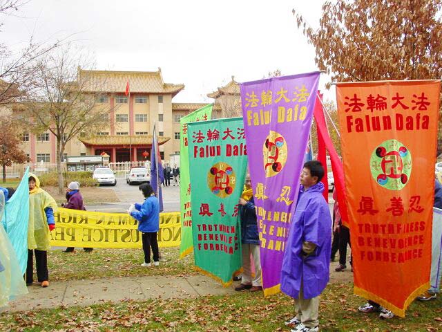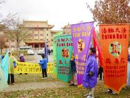 游行队伍中学员们高举许多中英文横幅,包括,“法轮大法好” 、“真善忍” 、“全球公审江泽民” 、“紧急营救受迫害的亲人” 、“停止对法轮功的迫害”等。他们还举着法轮大法在世界各地洪传和在中国受迫害的图片。长长的游行队伍,声势浩大,吸引着许多市民驻足观看。