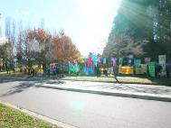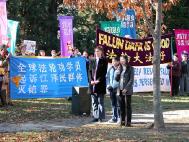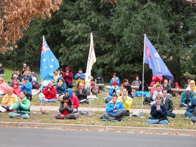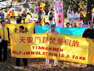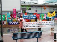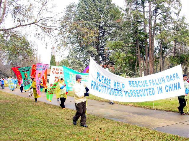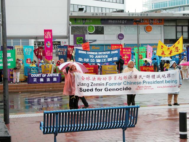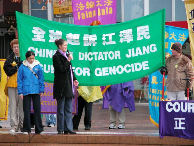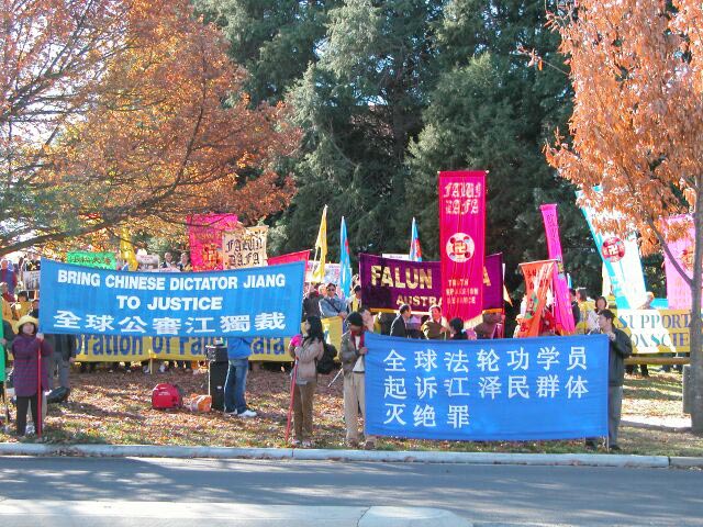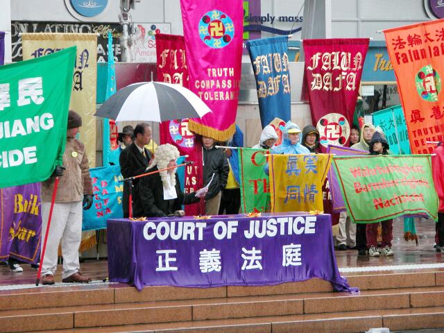 中午12点,游行队伍来到了堪培拉市中心。雨中的格力玛(Garema) 广场聚集了游行的人群和当地市民几百人,并观看了一场公审江泽民的模拟表演(mock trial)。演出中,“江泽民”被推上了正义法庭,四位证人分别出庭作证。