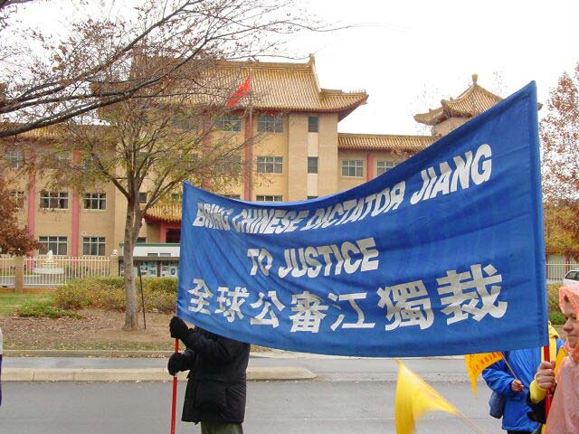 六月二十三日,法轮功学员在澳大利亚国会大厦前举行的庆祝法轮大法在澳洲把周年典礼之后游行来到中国大使馆前,又一次举行了“公审江独裁”的活动。