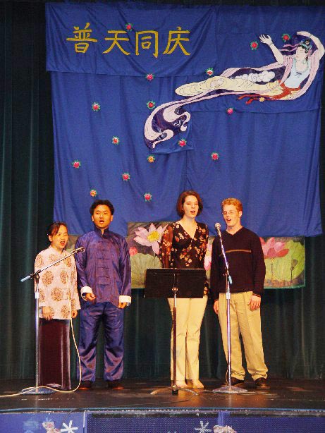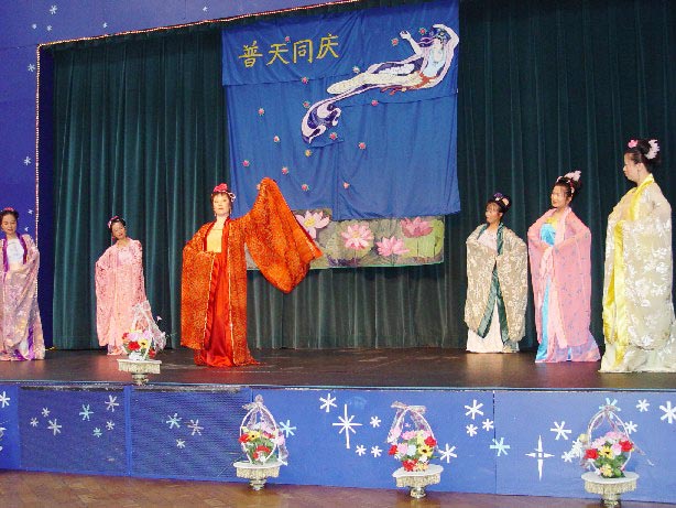 首先西人弟子和中国学员为观众表演了合唱“为你而来“;西人弟子弹奏并演唱了自己创作的歌曲。观众们为他们纯正的中文发音、优美的琴声和真挚的歌声所折服。舞蹈“莲花颂”和唐朝服装表演更是吸引了大量观众的目光和啧啧称赞。美丽的服装和莲花在女学员优美的舞姿中闪闪发光,传统中国音乐震撼人心。最后是学员自编的唐朝宫廷盛会形式的表演。不同的舞姿和服饰风彩显露了中国古代女性的典雅、庄重和高贵。同时受到欢迎的是学员刚劲的武术表演和广东话歌曲。