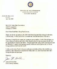 我向你们的会议和集会致以最美好的祝愿,并希望真、善、忍在中国、美国以及任何法轮功原理得以实践的地方广泛洪传。