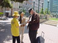 有两位白人观众走过来,用中文主动向我们招呼说:“你们好!”然后其中一个又说:“我就弄不明白,江××为什么要迫害你们这些好人?”有个学员回答说:“他怕好人多会威胁他!”他们说:“那他还是人吗?!……”最后,高兴地在征签板上签下了他们的名字,摆放了他们的位置。学员把控告江××、全球大审判的传单送给他们,然后招手告别。