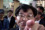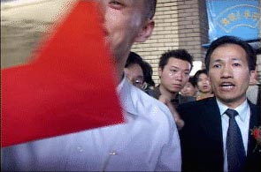 | 以梁冠军为首的一些人将多名法轮功学员打伤 | 花俊雄在谩骂 | 暴徒推搡法轮功学员 |
