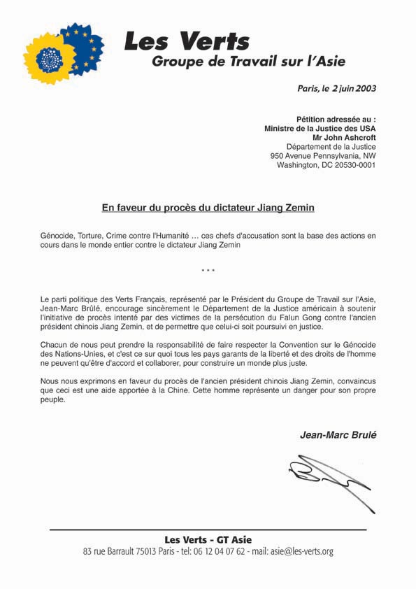 亚洲工作组主席让-马克·布鲁雷代表法国绿党真诚地鼓励美国司法部支持由迫害法轮功的受害者对前中国国家主席江泽民的起诉,将其绳之以法。