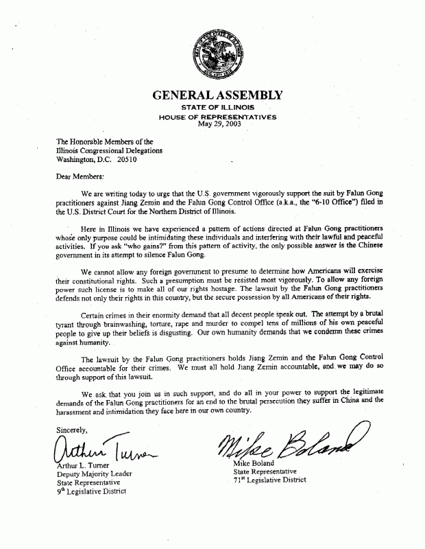 我们今天写信敦促美国政府积极支持由法轮功学员在北伊利诺伊州美国联邦地区法院递交的对江泽民和处理法轮功问题办公室(即“610 办公室”) 的诉讼案。
