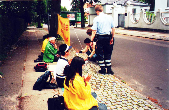整个事件要追溯到2002年8月下旬的一天。每天在中国驻丹麦大使馆前发正念和请愿的大法弟子突然被当地警察生硬地并不加任何解释地命令:离开我们自1999年7.20以来已经进行了3年多请愿的地点——中国大使馆正门对面。警察只允许我们在24米之外的路拐角处请愿。