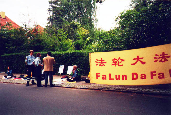 几年来,当地警察局(GENTOFTE)对法轮功的和平、友好以及一贯配合警察工作,遵纪守法已经有了深刻的了解,因而不理会中国大使馆的三番五次的无理抱怨及要求。中国大使馆就绕过当地警察局,把抱怨信送到警方的高层,利用警方高层对我们没有直接了解的弱点,迫使当地警察局在上级的压力下,与他们达成妥协,把我们至少挪到10米以外。