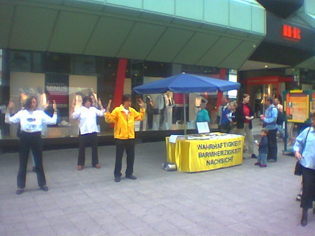 【明慧网2003年7月15日】上周六,我们在Darmstadt市举办了一次信息日活动。我们向该市市民和参加集市的人们讲述了关于香港第23条和江××因群体灭绝罪被告上法庭的情况。我们做了两个展板,分别贴在一块竖板的两侧。很多人到我们这里来,展板很显眼,所有人都能看到它。