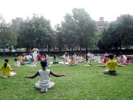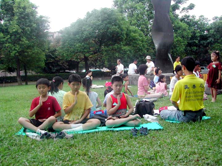 待大伙儿游戏兴致稍微缓和后,小弟子们排好炼功队形准备炼功,炼功音乐一响起,五套功法接着炼,动作缓、慢、圆,场面一片祥和。虽然五套功法只炼一个钟头,但对很多小弟子而言已算是难得了。
