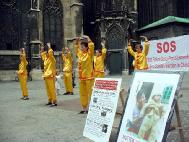 来自奥地利各地及斯洛伐克的弟子环绕维也纳市中心举行了SOS游行。游行队伍途经维也纳歌剧院、霍夫堡皇宫、英雄广场、施蒂芬教堂等游人聚集的景点,格外令人注目,许多路人大声读着横幅上的字,纷纷索取资料了解。更有些华人游客惊奇地看到这么多修炼法轮功的人以及“全球公审江泽民”等横幅。游行队伍抵达施蒂芬广场后,开始了在市中心的功法表演、书法表演、露天音乐会等各种形式的活动。