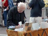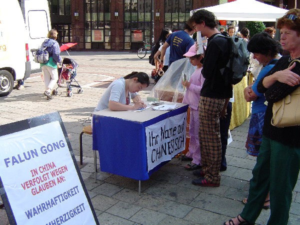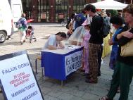 6名法轮功弟子穿着中式炼功服装演示功法。整齐、祥和的功法表演吸引了上百人观看。许多游客纷纷拍照、摄像,记录下这美好的景象。旁边有弟子用广播介绍功法,并讲述这样和平、有益身心的功法在中国受到残酷的真相,呼吁人们共同来制止这样的国家恐怖行为。了解了真象的人们纷纷在呼吁释放法轮功学员熊伟的信上签名并祝大法弟子们成功。下午有几分钟突然大雨点落下来,一个表示支持我们的过路人毫不犹豫的脱下长围巾,不顾自己被淋湿,盖在桌上的签名信和真象资料上。一位从中国大陆来的华人说,在中国许多人心里都明白法轮功学员是无辜的,甚至他认识的一些警察都不愿做迫害法轮功学员的坏事。
