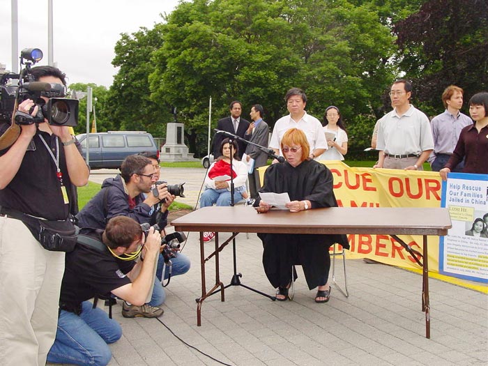 【明慧网2003年7月19日】7月16日星期三,在中国江氏集团镇压法轮功四周年之际,多伦多法轮功学员在加拿大安大略省省议会前举行大型集会,呼吁全面停止在中国对法轮功的残酷迫害,对发动这场迫害的江泽民进行大审判。