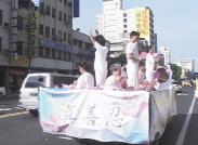 之后,大法弟子们精神抖擞地出发游行。此次游行的路线安排得很好,行经高雄市五大百货公司人潮众多的地方,各地区学员分别穿着”公审江泽民”、”迫害事例”及”法轮大法好”的背心,手拿着各式活动布条进行游行,扶老携幼、祥和壮观的场面令高雄市民印象深刻。