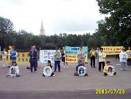 大法学员在中使馆前集会向媒体及社会各界发布的通告提出:“我们呼吁世界一切善良的人们,政府和媒体谴责江泽民集团的罪行和利用外交向各国施压的非法行径。制止镇压法轮功。犯有酷刑、反人类罪和灭绝群体罪的罪犯应受到正义的审判和法律的制裁!”
