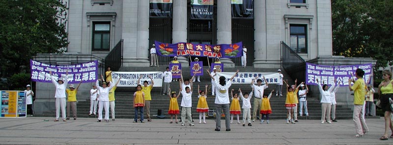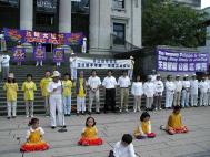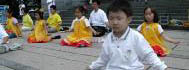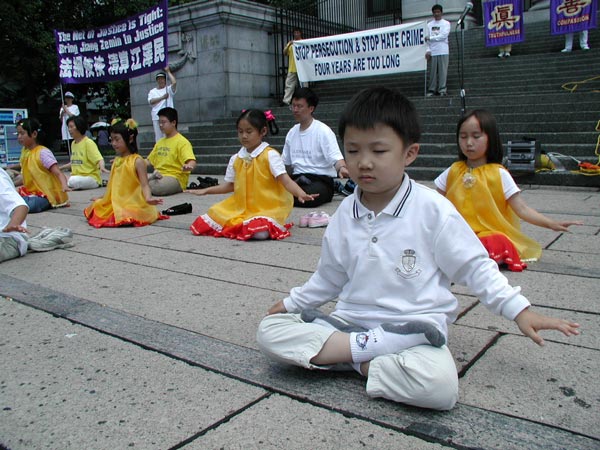 近十名明慧学校的小弟子也参加了新闻发布会,在炎炎烈日下,认真地向行人表演五套功法。