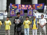 法轮功学员在艺术馆前阶梯的上面拉开了“法轮大法好”的大型横幅,顺势下来,三名学员端持“真善忍”。在阶梯下面,中英文 “天理昭昭 公审江泽民”、“停止四年迫害 正信坚不可摧 唤醒正义良知”等横幅无不在向世人展示,法轮功学员在经历了四年的被残酷迫害后,已经变得更加坚定、成熟、理性。