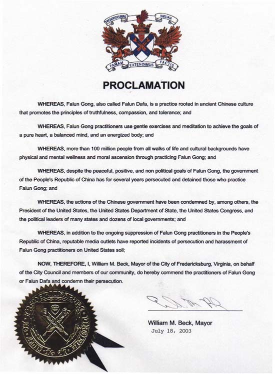 因此,现在,我,维吉尼亚州佛莱德里克堡市(Frederickburg, Virginia)市长,威廉.贝克(William M. Beck),代表市政厅及我们社区的成员表彰法轮功(法轮大法)学员,并谴责[中国江氏政府]对他们的迫害。