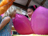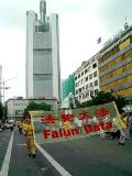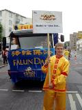 参加文化节游行的有约六十个团体,其中之一是一队由德国人和中国人组成的以“中国的文化与修炼”为主题的法轮功修炼者。几个穿着华贵的金黄色中国传统服装的法轮功学员在一辆装饰着中国风景画的彩车上展示功法。美妙的音乐响起,女学员们随之翩翩起舞,一切都是那么和谐。她们身着传统的中国服装,表演几千年来在中国深受喜爱的民间节日庆典舞蹈──扇子舞、姿态各异、美不胜收。不断有孩子拉着父母来看我们的游行。孩子的父母不解地问,为什么法轮功在中国遭到镇压?